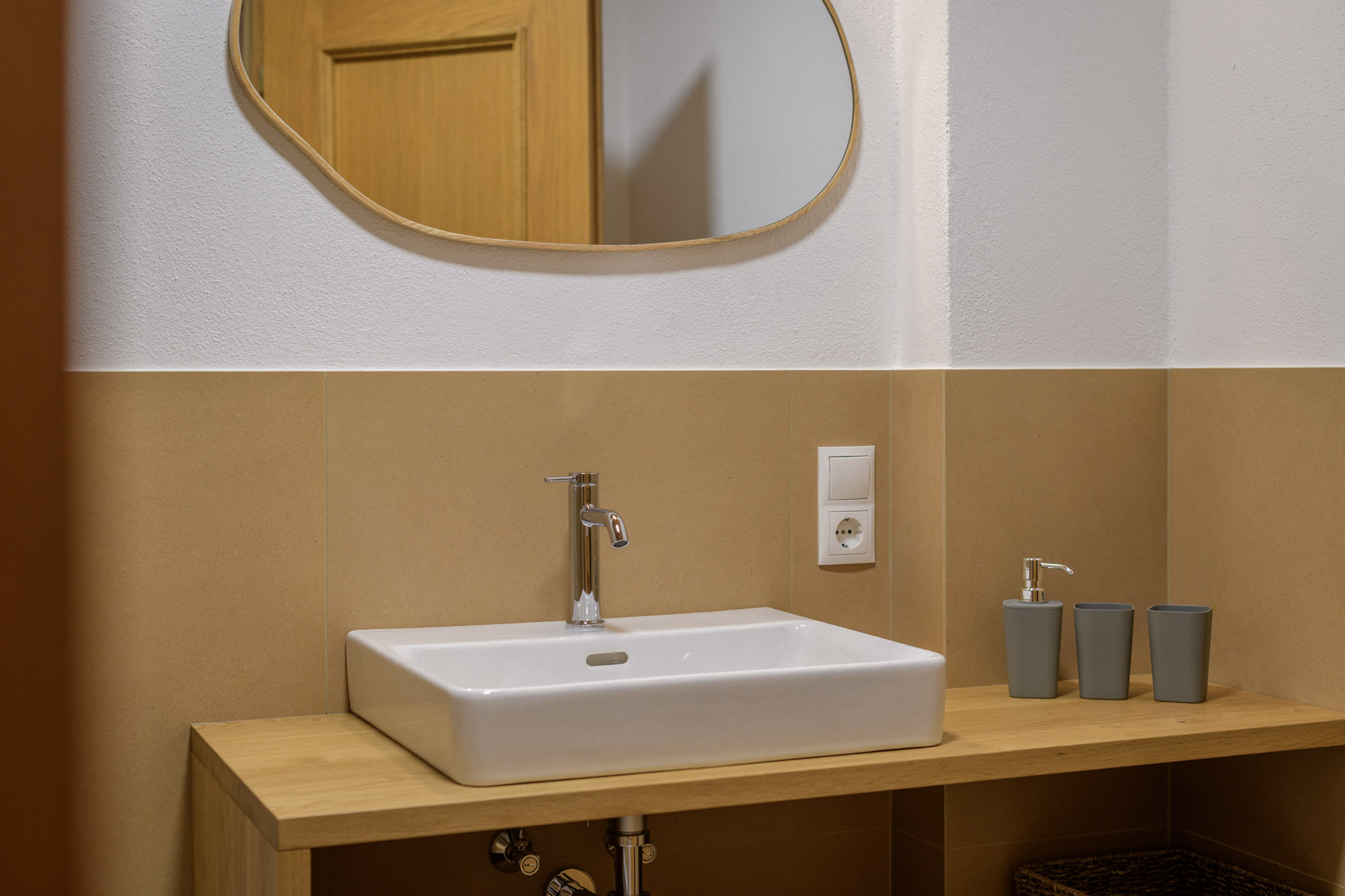 Ausstattung: Schlafcouch im Wohnzimmer, Induktionskochfeld, Dunstabzugshaube, Kühlschrank mit Gefrierfach, Geschirrspüler, Toaster, Wasserkocher, Kaffeehandfilter, Espressokocher Mokka, Geschirr & Töpfe, zwei TVs mit SAT, kostenloses WLAN, Fön, Safe, Heizung, Nichtraucherwohnung